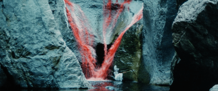 Ito’s sense for the theatrical and the surreal persists as Jailhouse 41 continues to explore the idea of the female as a mythic creature. The fugitives come upon an old shack in the forest. In one of the film’s more astonishing visual flourishes, the shack bursts apart in front of us, revealing the seated figure of a witch. Colours go haywire and any pretense to naturalism is abandoned. Here we enter a sequence straight out of traditional Japanese theatre, as a brief history of all the women present is foretold to the inimitable sound of the shamisen. The reality of the film has been beautifully broken and our understanding of these women has been enriched. Each carries a burden that unites them as archetypes of feminine suffering. In this capacity they are Nami’s disciples. The presence of the witch foretells Nami’s own evolution into a more mythic figure within the series. The witch recognises their shared otherness, and passes to Nami a knife which will become even more significant later in the film.