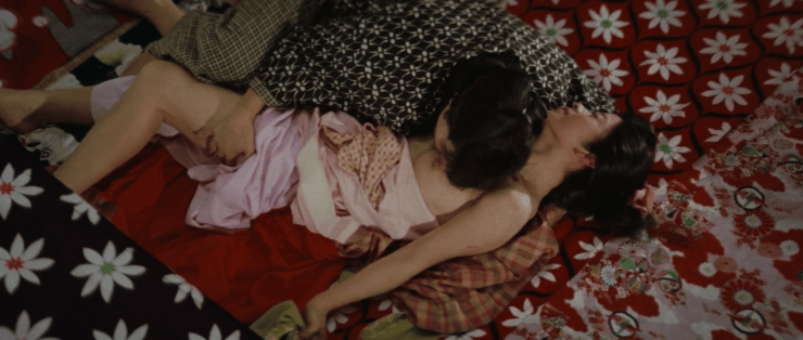The debasement of Oito sounds like prime fare for such misogynistic filmmaking, but the tone and Ishii’s depiction of the ordeal places her firmly in the viewer’s favour. Gratuitous it may be, but we are undeniably asked to condemn the injustices that befall her. It may not contain the artful heft of, say, Kenji Mizoguchi’s The Life Of Oharu, but I would argue that cinematic joie de vivre is exemplified in other ways. Consider, for instance, the sequence in which Oito and Hanji embrace as new lovers which takes place within a maze of patterned rugs. It is as though the two of them are lost within a kaleidoscope. These are the kind of dazzling images one might expect of Alejandro Jodorowsky.