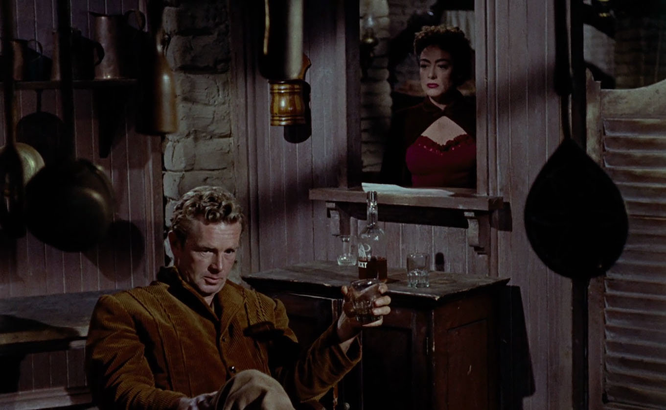 In the township of Red Butte, Vienna (Joan Crawford) vies for power with another woman; her rival Emma Small (an incredible Mercedes McCambridge). Loosely controlled by Emma, a pack of amiable local wannabe-outlaws rob the town bank, putting Vienna in a compromising position as an implied accomplice. Anticipating trouble and looking to toughen up her own position, Vienna reunites with her old flame Johnny Guitar (Sterling Hayden); a musician and gunslinger who goes toe-to-toe with her throughout the film but remains, keenly, behind her all the while.