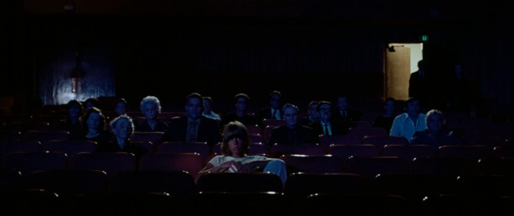 Toni is the third and youngest of the bohemian types that shack up with Arletty but she runs off to the movies in town for something to do. The theatre is deserted when she walks in and sits but, slowly, the seats around her start filling with the ghouls, until she is surrounded. Realising their presence – and that she is locked in with them – Toni flees to the front of the screening room where her own terror replaces the scenes of violence previously playing on the big screen. Violence and horror has bled into her reality… and ended it. It is an astonishingly rendered set-piece.